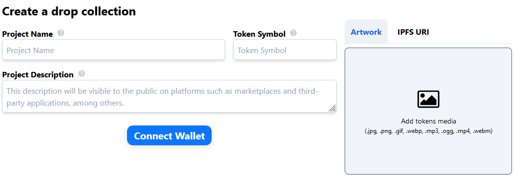 After connecting your wallet, a form will appear where you can input all the necessary collection information. The minimal requirements to deploy an NFT collection include 'Project Name,' 'Project Description,' and at least one media. Naturally, you will need sufficient funds to cover the deployment gas fee.