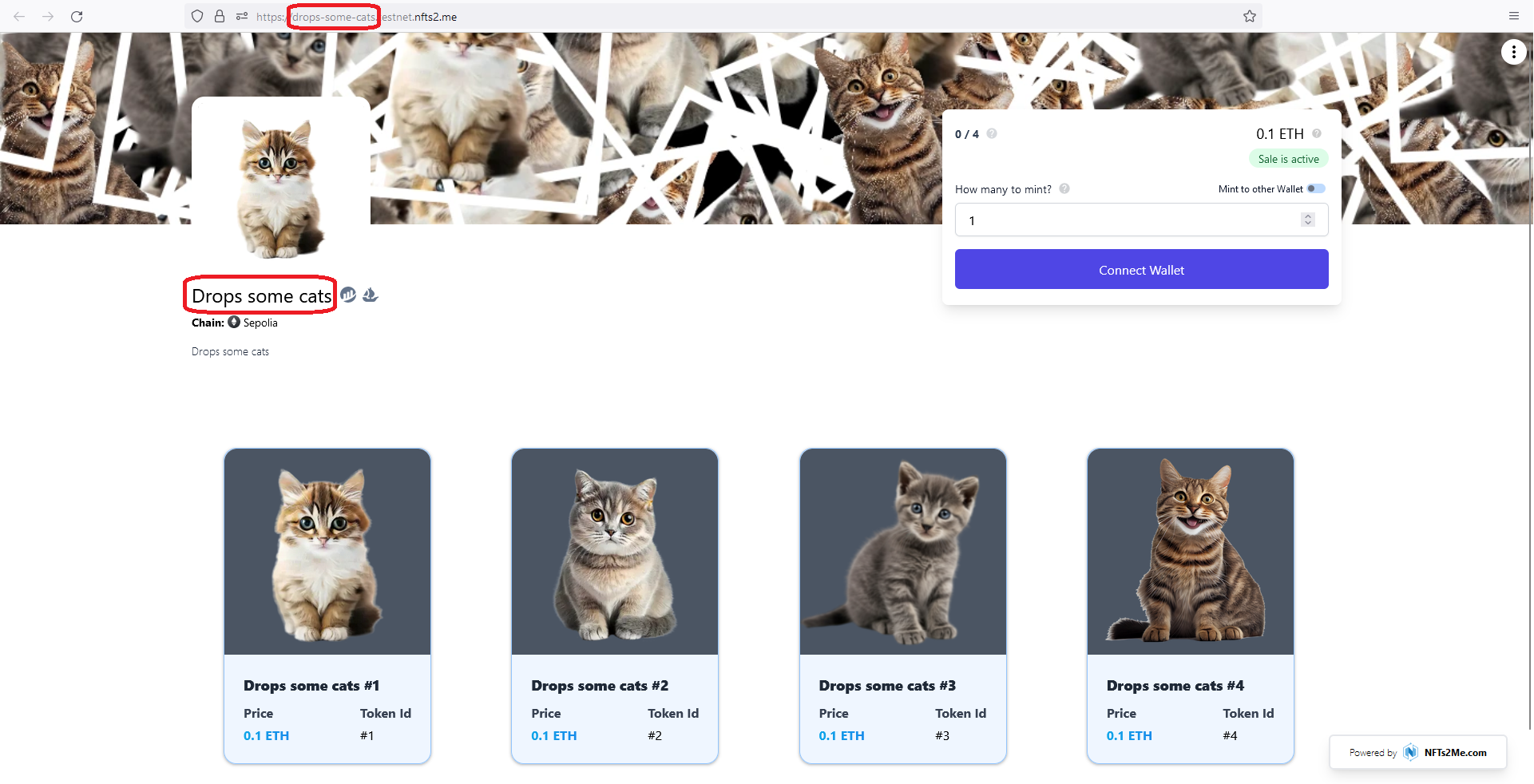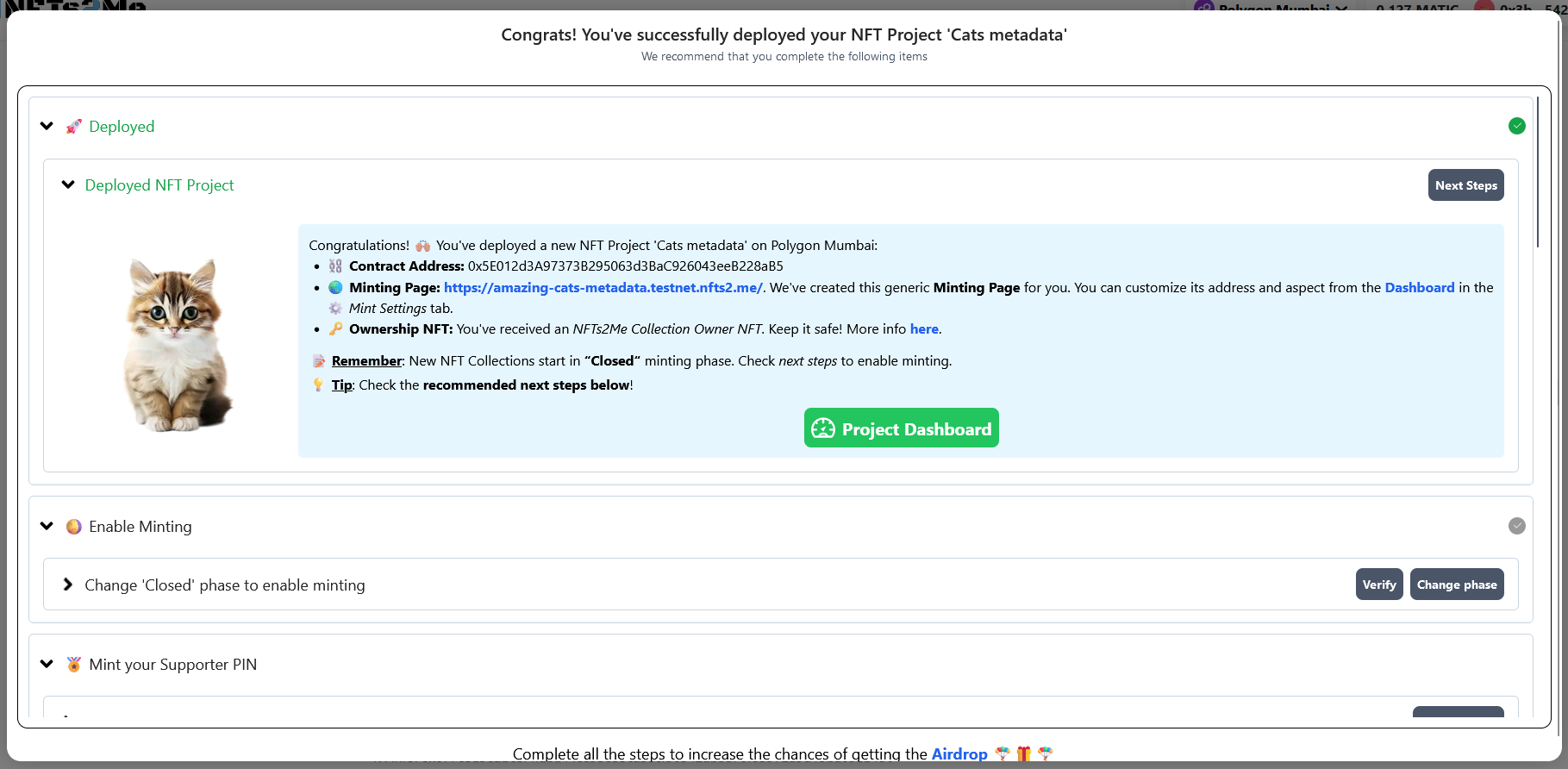 Later, on your [project dashboard](https://github.com/nicolasmarin/nfts2me-docs/blob/main/create-and-deploy-nft-collection/broken-reference/README.md), **you can change your minting page collection name** and your **subdomain** minting page URL, but the original name will be written on the blockchain, and marketplaces will use it.
