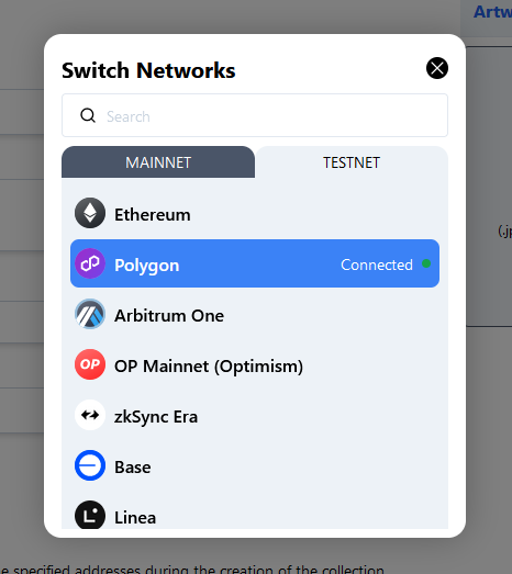 1. **Network**: You must select which chain to deploy to your NFT collection. You can choose between the mainnet and the testnet. Mintpad is integrated with a wide range of chains; thus, a search feature exists through which you can filter them.