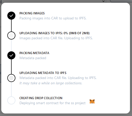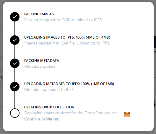 The last step is to deploy your collection on your selected chain. Click on the deploy button to see how the deployment process progresses. The process you will see is as follows: