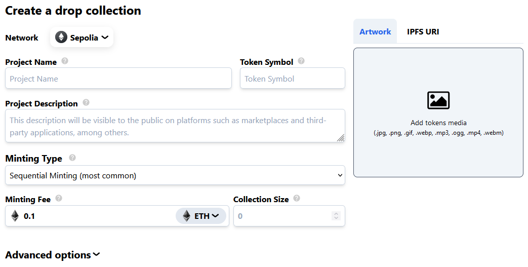 6. **Minting Fee**: This is the price the user must pay to mint a new NFT from your collection, excluding the protocol fee (which depends on the chain).