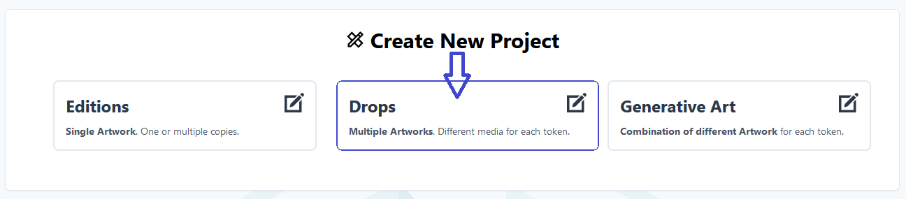 To create a "Drops" project, choose the second option labeled "Drops" on the Mintpad no-code app.