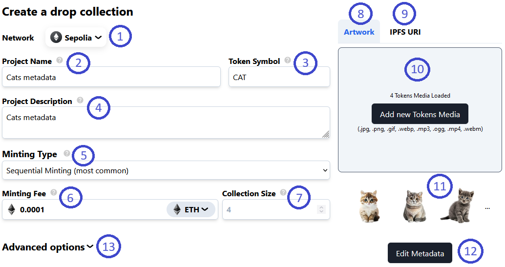 9. **IPFS URI**: You can reuse artwork you have previously saved on IPFS. The complete explanation is in the '[Custom IPFS URI](https://mintpad.gitbook.io/docs/features/custom-ipfs-uri)' section.