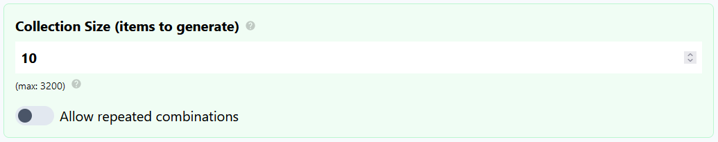 Enable **Allow repeated combinations** to allow NFTs with repeated combinations (**the same image but different IDs). This will also enable increasing the project size beyond the total number** of possible combinations.