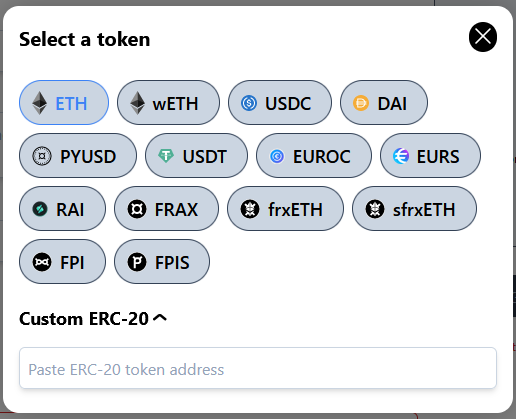 You can choose the token you want to receive when minting from the available options on the chain, or indicate a custom ERC-20 token address: