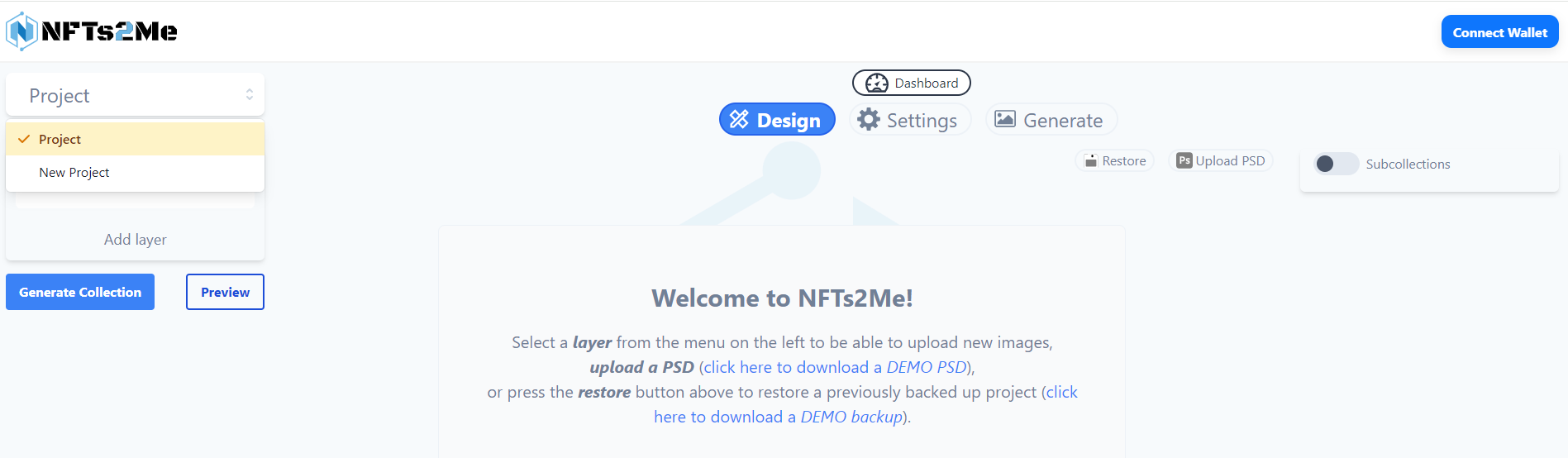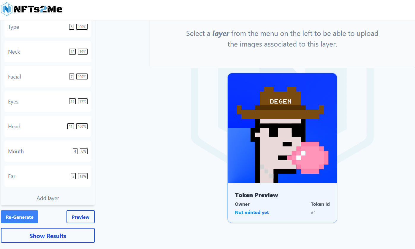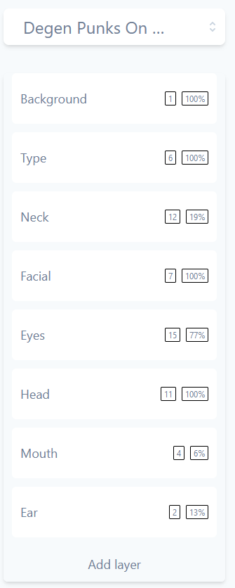 This type of project allows you to add layers to your collection and combine them with the number of combinations you choose, creating an image and an NFT for each combination. Additionally, it adds metadata related to the information of the layers that compose it and their rarity.