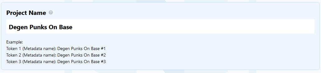 * **Project Name**: That's your collection name. Please set a descriptive name for your collection in the chain contract. Please note that we will also use that name to generate your collection name, which will be displayed on your minting page, and when someone mints any NFT, marketplaces will also display that name. Furthermore, we will generate a subdomain name based on it. Also, it will be shown to you how to manage your collections on the Mintpad dashboard.