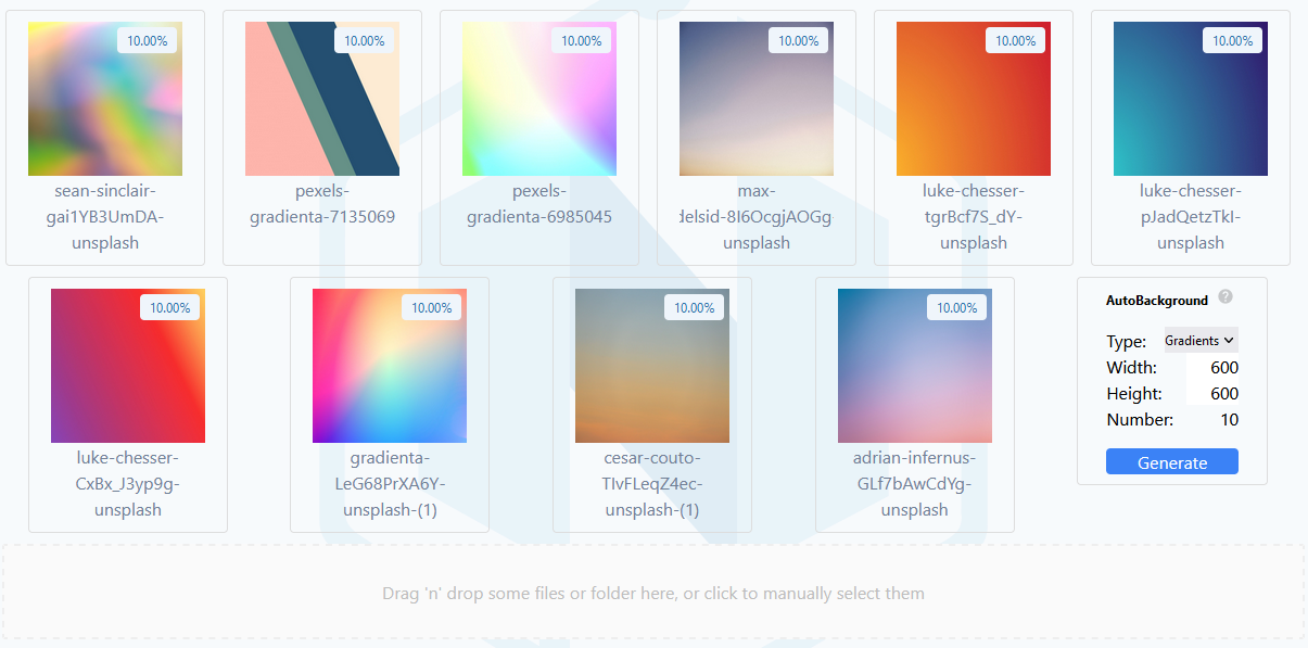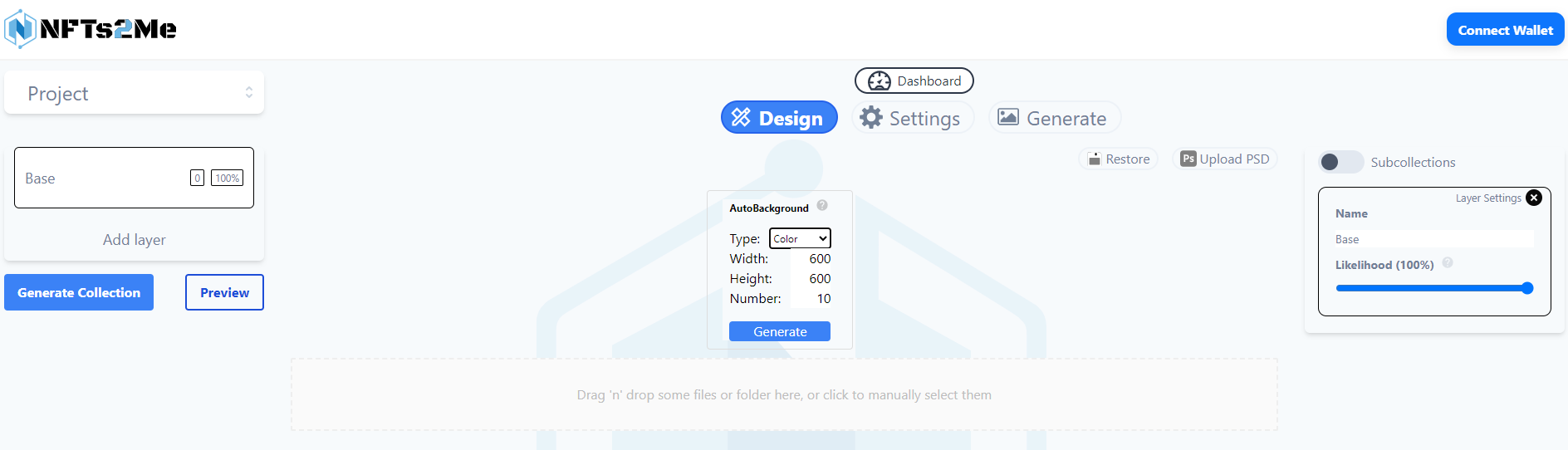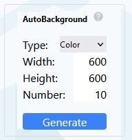 It is designed to set the backgrounds of your NFTs. These backgrounds can be simple colors, gradients, etc. For this purpose, when clicked on, this layer will display its details in the center, providing the "AutoBackground" utility. Here, you can choose from different background templates and specify the size of the images for your NFTs and the number of different backgrounds you want to compose in that layer. Once configured, click on the "generate" option, and the backgrounds you have configured will be generated.