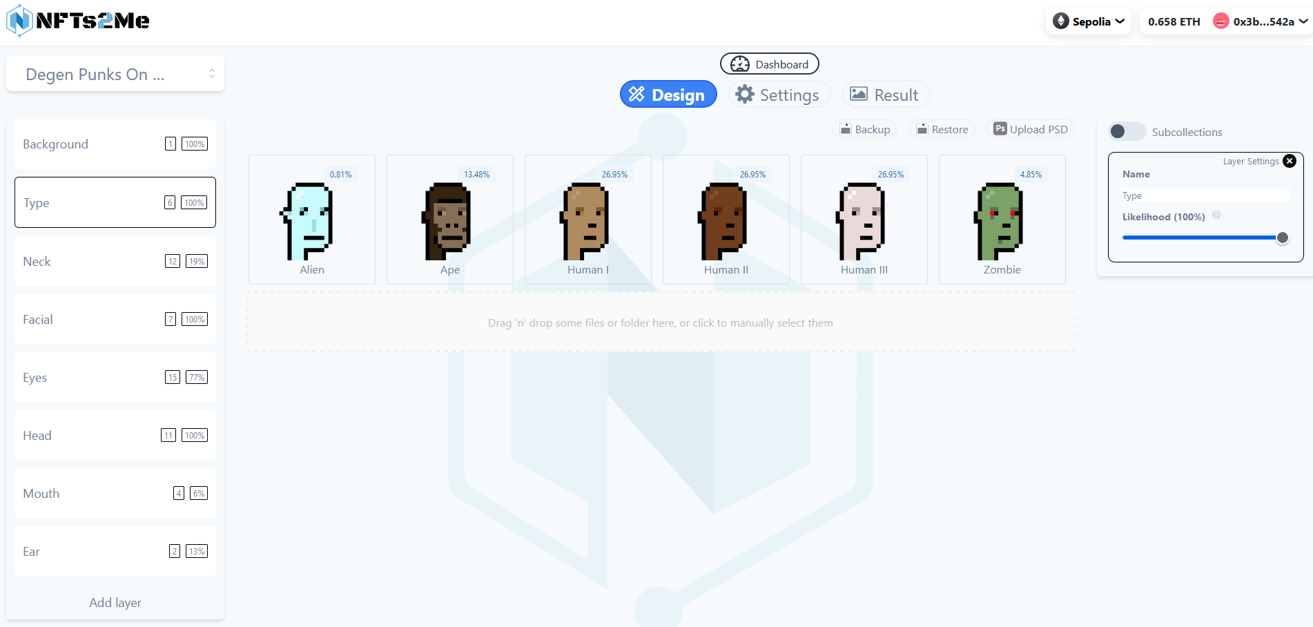 Then, on the left side, you will see the number of NFTs with each trait for every layer. You can select a trait or multiple traits, and the NFTs containing those traits will be displayed in the center. You can see an example in the image below. We have filtered by 'Type: Zombie':