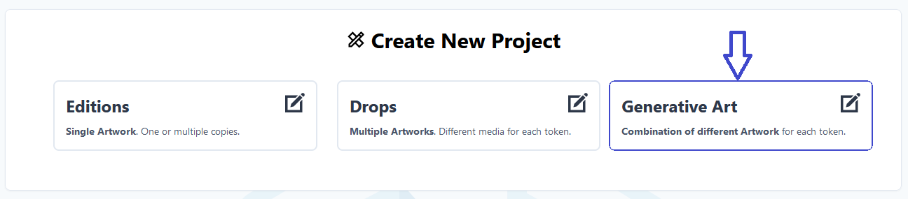 To create an "Generative Art" project, choose the third option labeled "Generative Art" on the Mintpad no-code app.