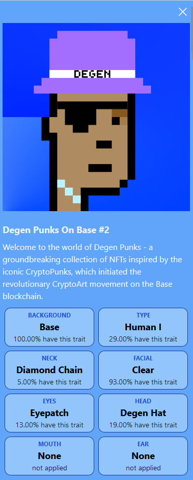You can click on an NFT to display its details in the correct zone. We have generated a trait for every layer and detailed the rarity of that trait: