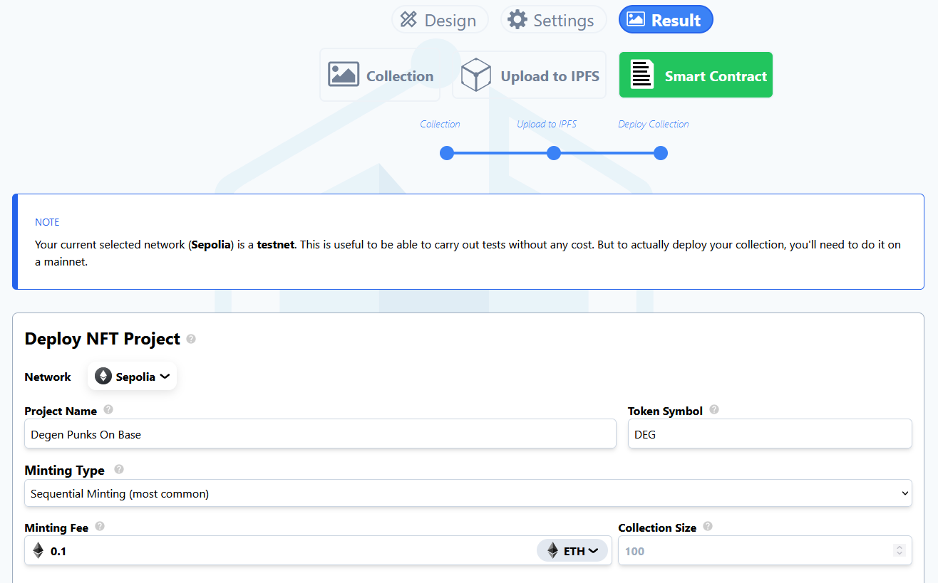 Once all the layers and images are configured and the collection settings are established, the next step is to generate the combinations and deploy the smart contract for the NFT collection.