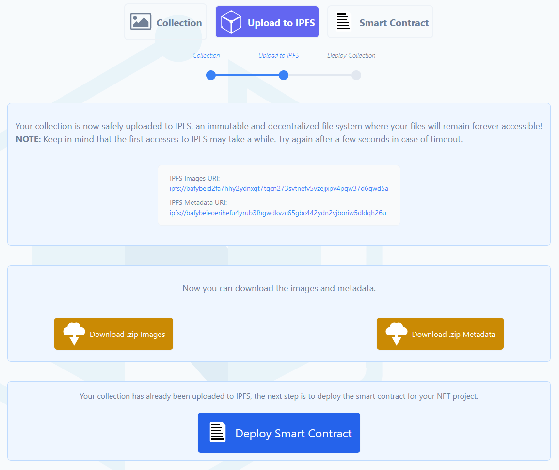 Once you are satisfied with the result of these images, click on the "Upload to IPFS" button and wait for it to finish packaging and uploading the collection.