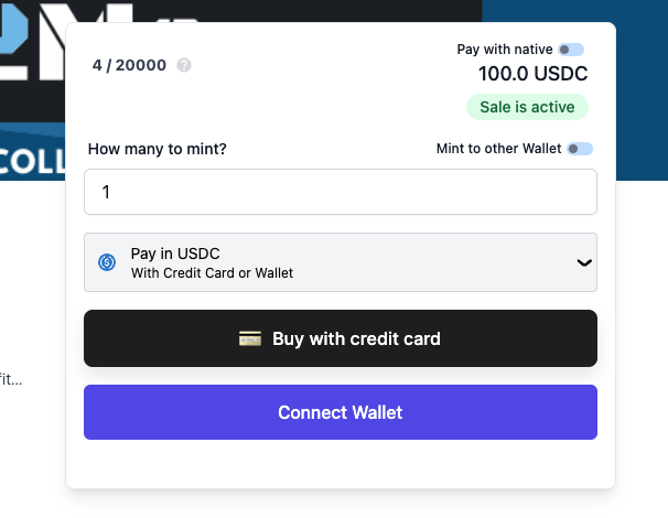 Despite the user paying in FIAT, you'll receive the payments in crypto using the ERC-20 (e.g., USDC) or Native Token (e.g., Ether, MATIC, BNB...), in which you set up the minting price of your collection.