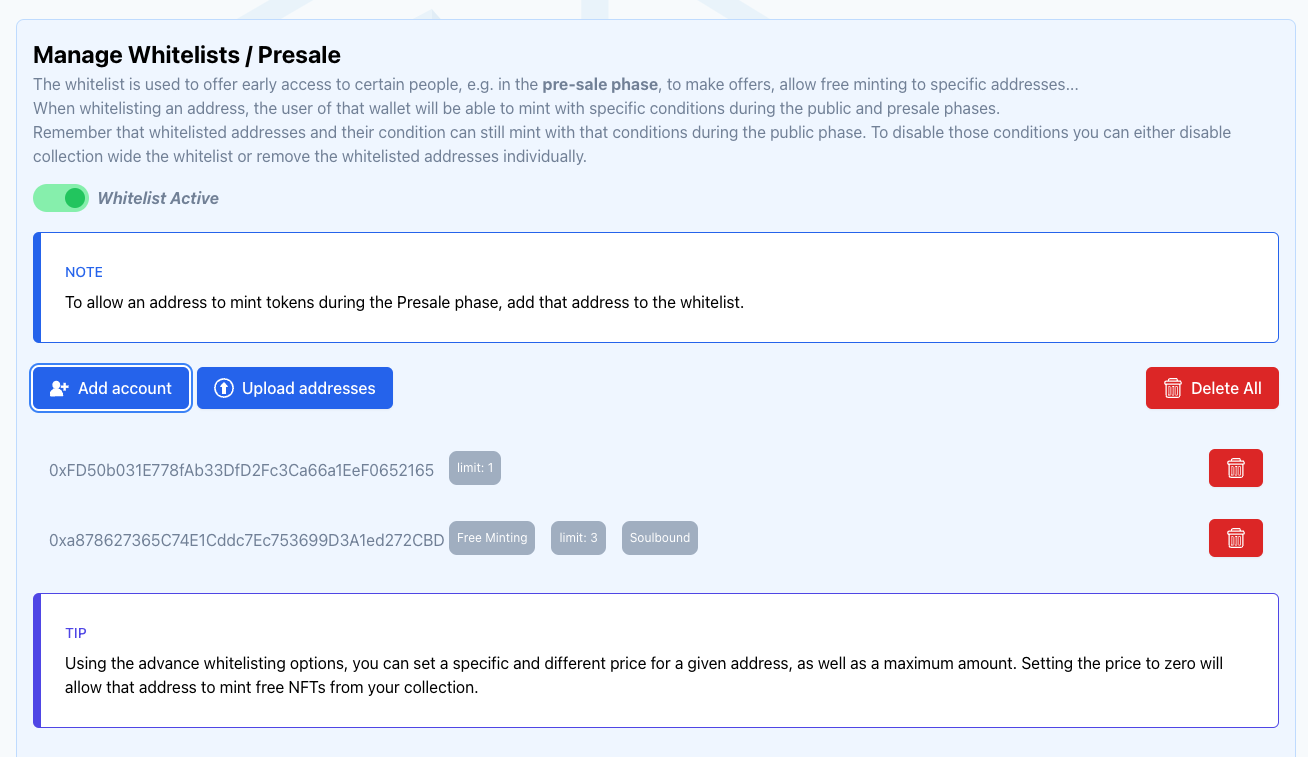 When whitelisting an address, the user of that wallet will be able to mint with specific conditions during the public and presale phases. Remember that whitelisted addresses and their conditions can still mint with those conditions during the public phase. To disable those conditions, you can either disable the whitelist collection-wide or remove the whitelisted addresses individually.