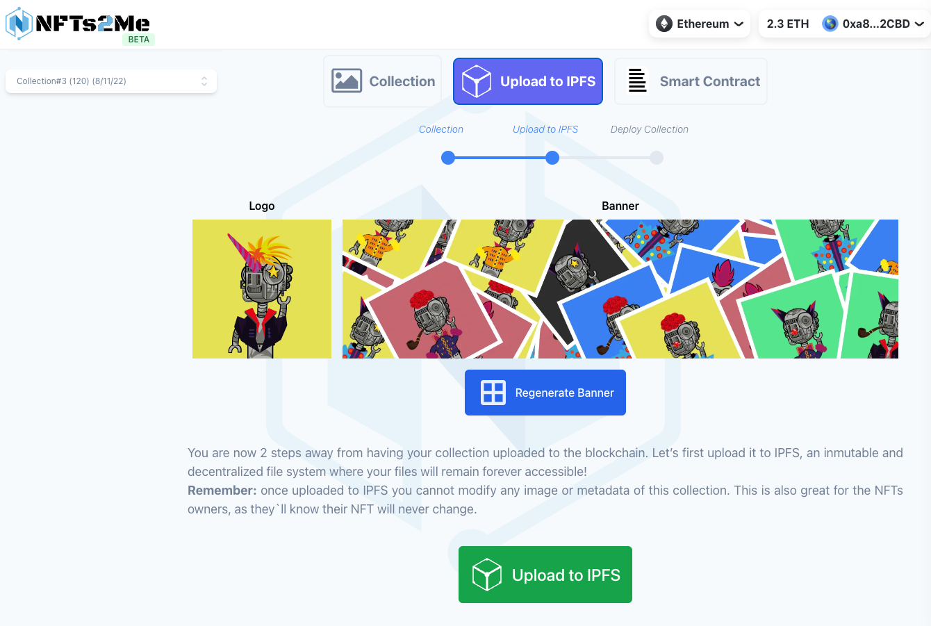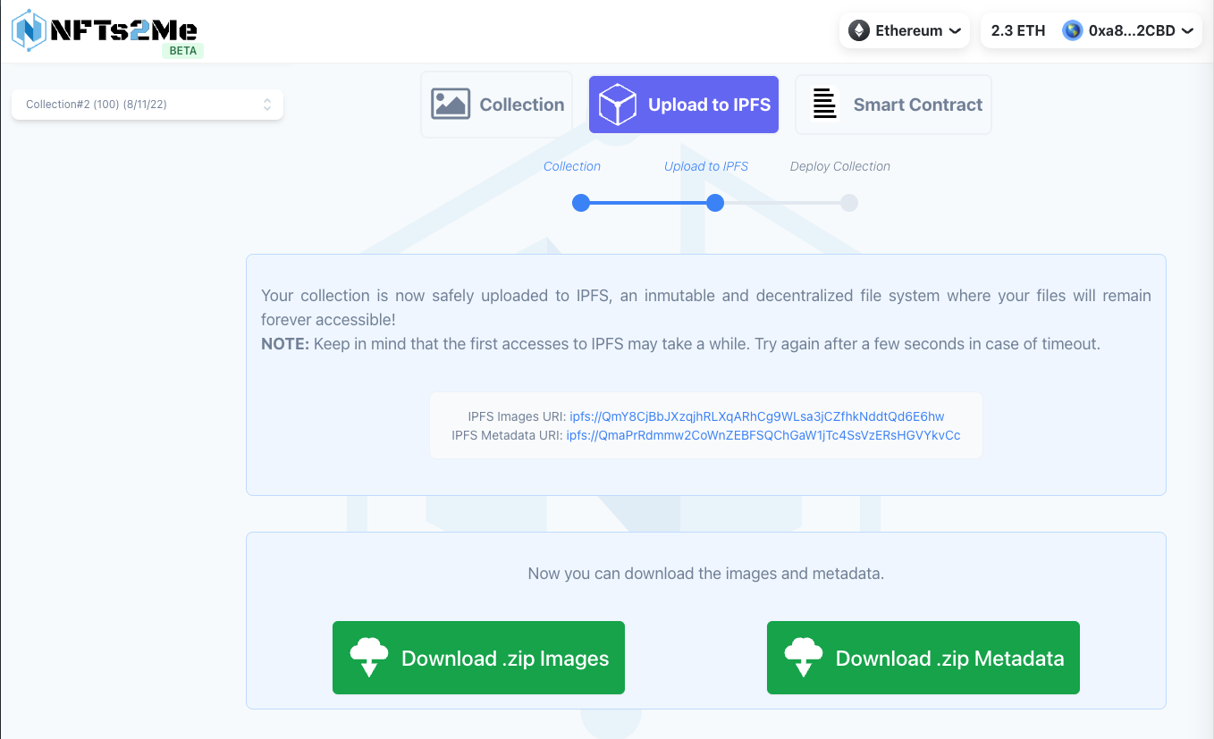 While your collection is being deployed, the tool automatically uploads everything to IPFS without you having to lift a finger, making it automatic and secure: