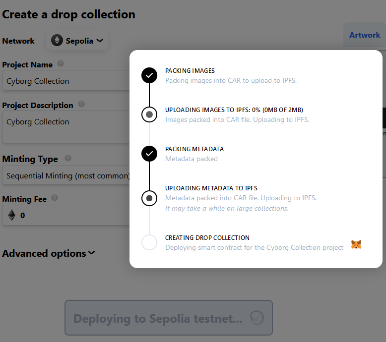 Once completed, your media and metadata are uploaded to IPFS, and your collection is deployed on the network, ready for others to view and mint! :tada::tada::tada: