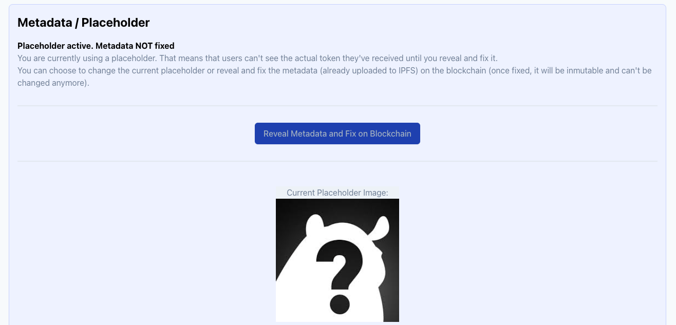Choose whether to reveal metadata from the beginning (all metadata will be public) or use a Placeholder image to hide it until you decide to reveal it. If you choose to hide it using a placeholder, not only will its image be hidden, but its name, description, and attributes will also be hidden. Once revealed the information, it will be fixed on the Blockchain, and you won't be able to change it.
